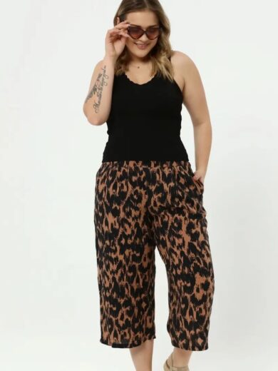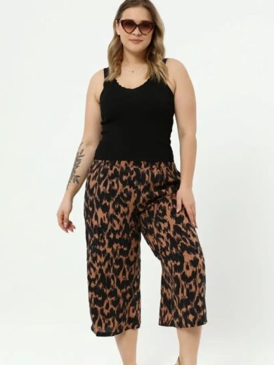 Siyah Renkli Kahverengi Leopar Desenli Büyük Beden Yarım Şalvar Kapri Pantolon - Gardrobun - SJ00878